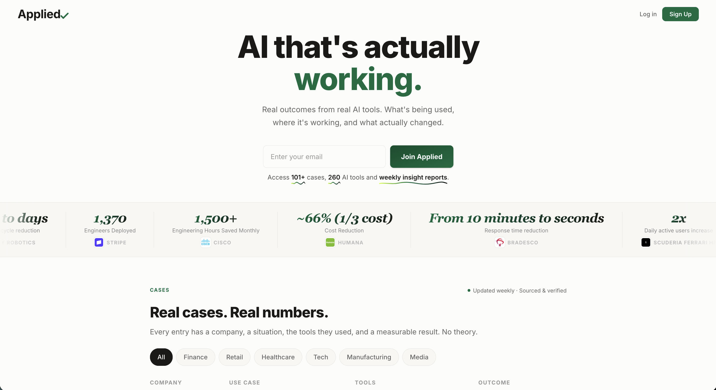 A curated intelligence platform tracking how companies actually use AI tools. Offers 194+ verified case studies with measurable outcomes, AI tool listings, industry filters, and weekly research reports. Free to access with an account.