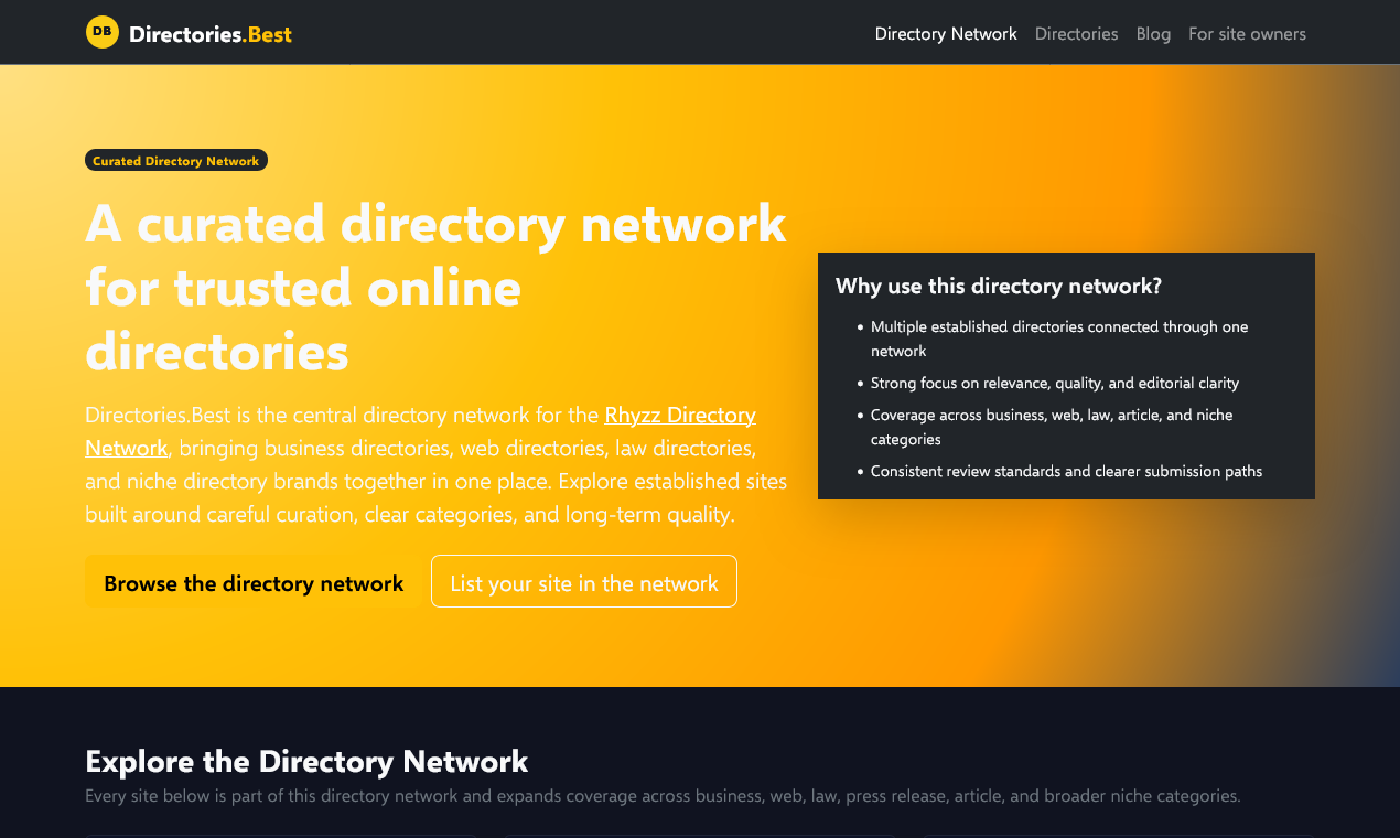 Directories.Best is a central hub for the Rhyzz Directory Network, connecting business, web, law, article, and niche directories. It helps site owners gain visibility through curated listings with consistent editorial standards and clear submission paths.