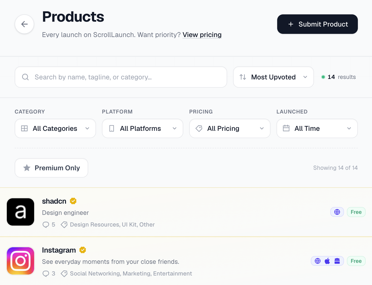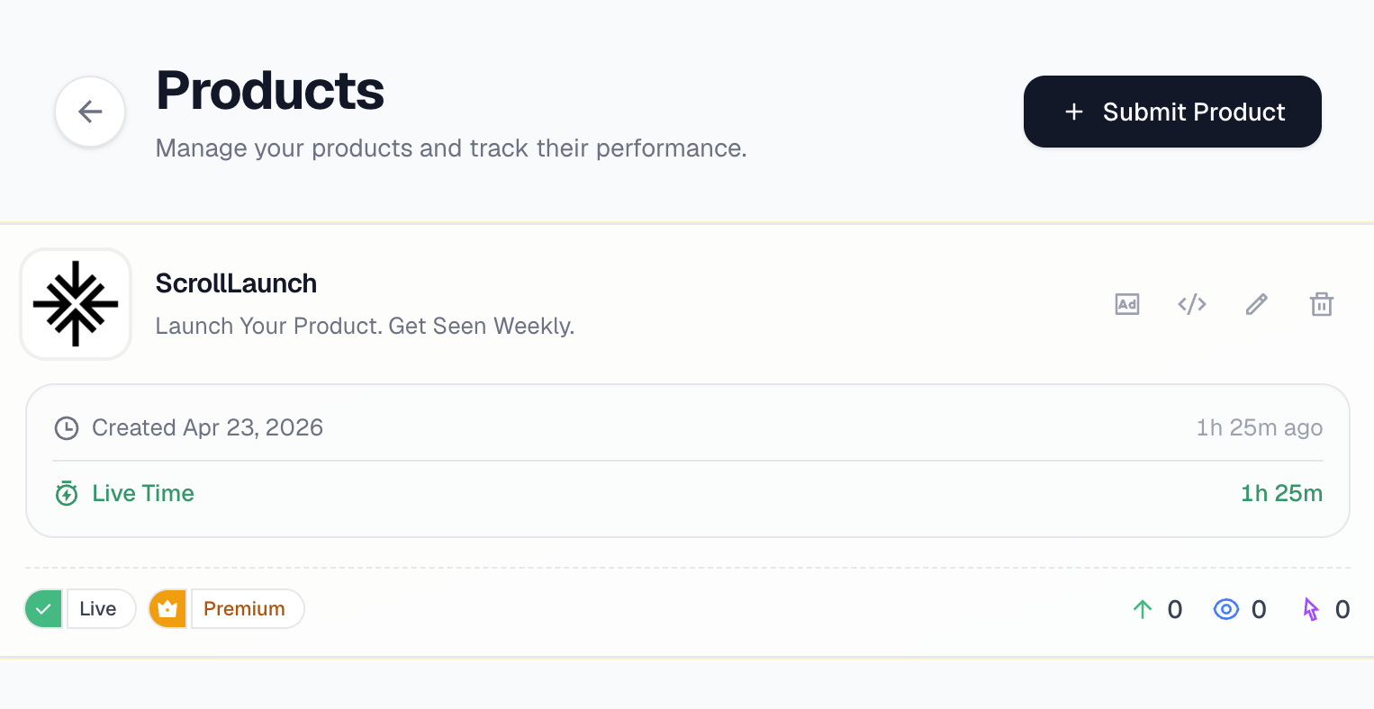 ScrollLaunch is a product launch platform where makers submit their products to gain visibility, earn domain-rating backlinks, and compete on a weekly leaderboard. It also offers a curated directory of listing sites ranked by DR.