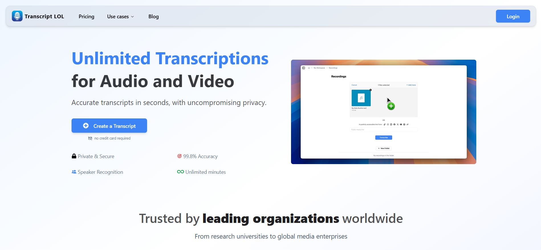It's is a transcription tool used to convert any audio or video into text in a few seconds. It produces transcripts that are up to 99.8% accurate. It helps creators save hours of manual work by automatically turning recordings such as meetings, interviews, lectures, and webinars into clear transcripts within a few minutes. It's mainly used for podcasters, students, marketers, and teams who want to repurpose audio content into blog posts, notes, captions, or social media content.